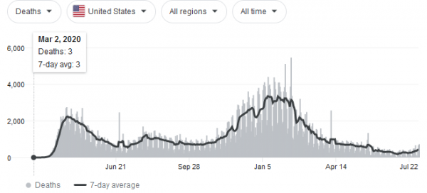 Cases, again based upon a PCR test just pulled from the market by the FDA, began to rise in early June. By mid-July they had already peaked, just as expected from a seasonal flu. They have now fallen by 50% from the peak. I bet you haven’t heard that on any propaganda spewing mainstream fake news media outlet. Twitter and Facebook would ban these facts and declare them misleading.